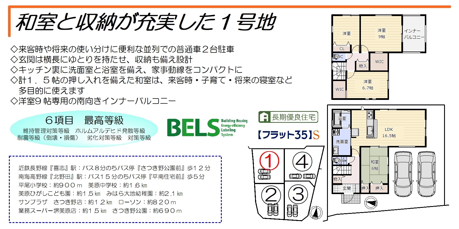 駐車2台可能な全4区画のうち、和室と収納が充実した1号地