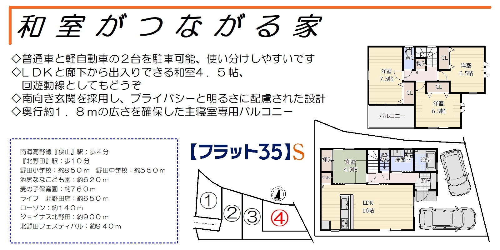南向きバルコニーの全4区画、和室がつながる家の4号棟