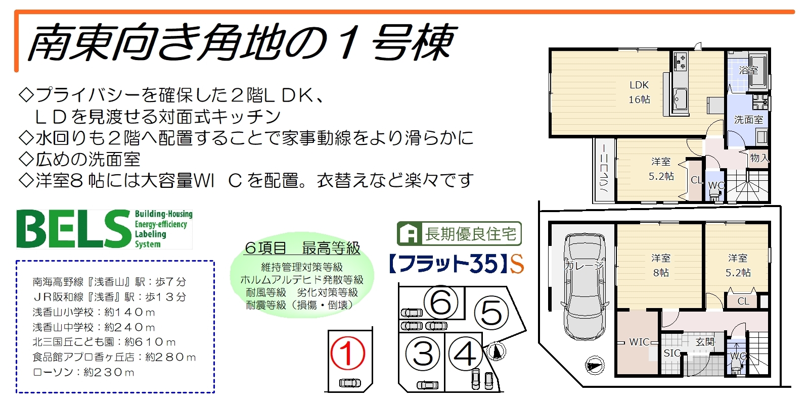 南東向き角地の1号棟、プライバシーを確保した2階LDK・水回り