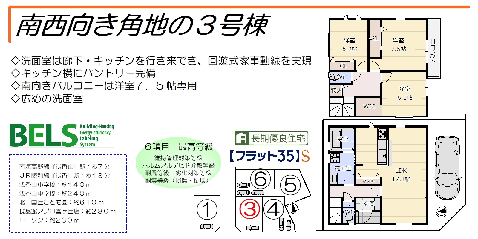 南西向き角地の3号棟、回遊式家事動線が特徴