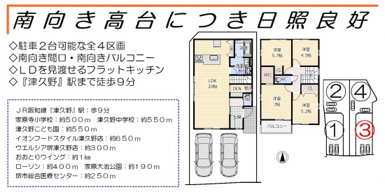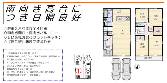 南向き間口・南向きバルコニーがある駐車2台可能な全4区画
